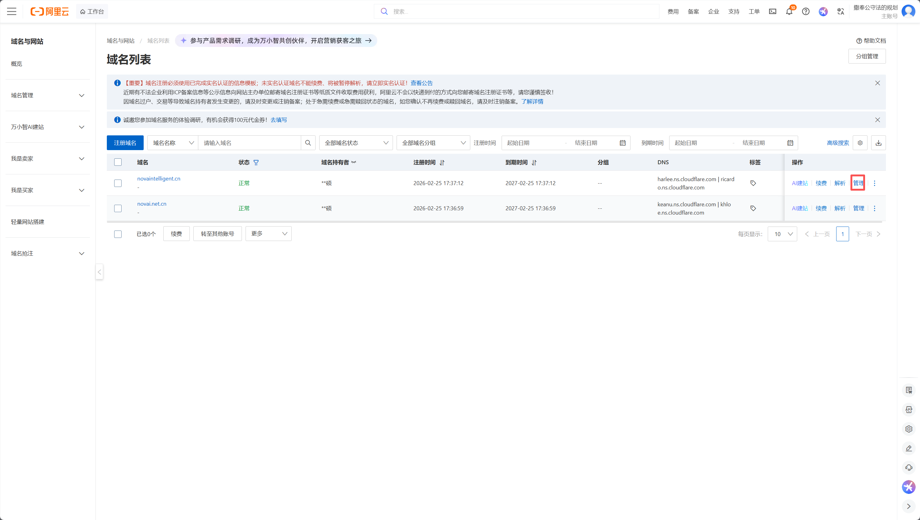 4、在下一步中,复制对应的解析值,打开阿里云服务器域名管理进行配置,选择自己购买的域名(如果在腾讯云买的,就去腾讯云添加解析,效果一样的,这里不再赘述)。