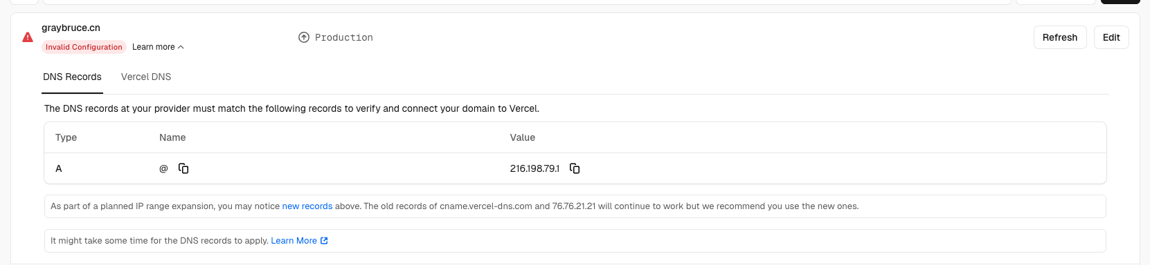 3、选择后,会提示进入域名编辑页面,需要在这个页面添加解析。解析值来源于第二章中vercel给的内容。