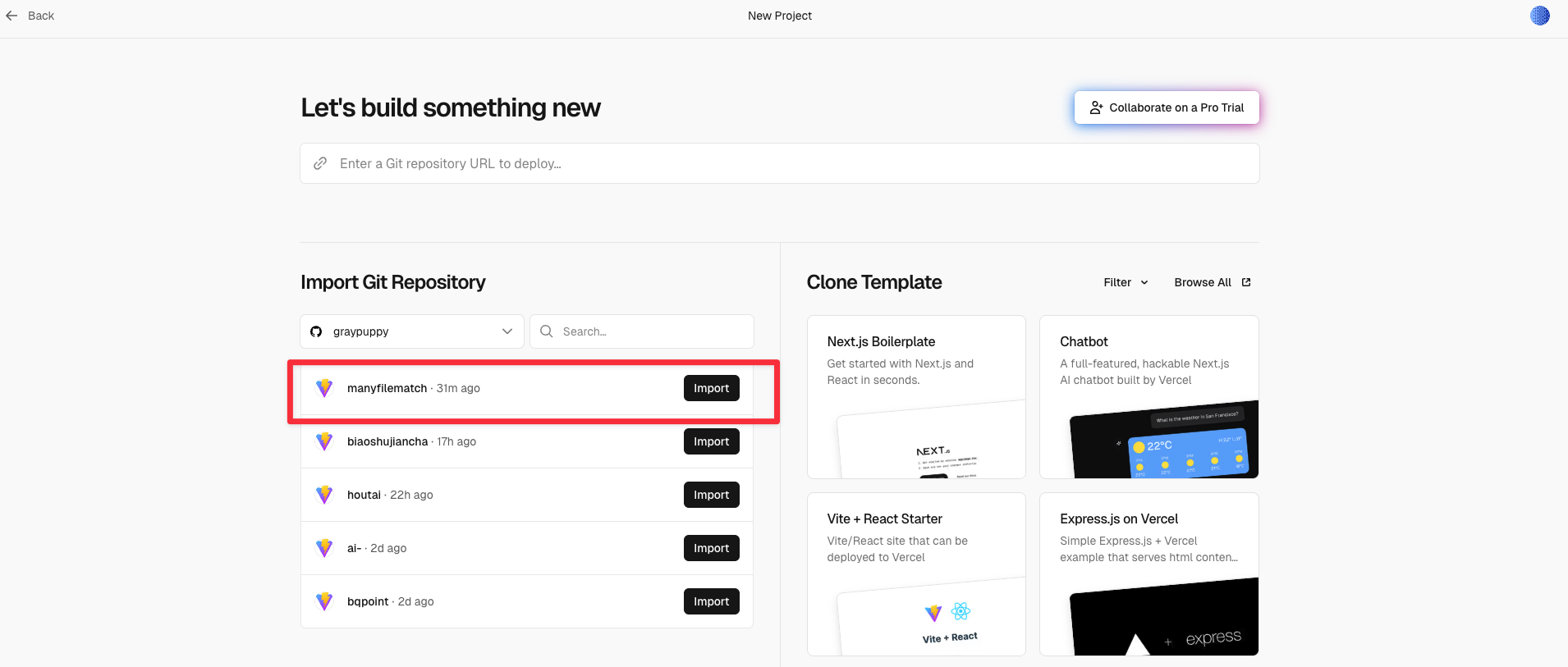2、选择(import)你github的中要部署的项目。如果没有用github登录,可以在这里复制第一章中你的github地址。